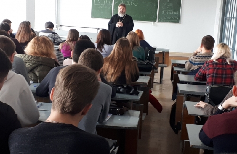 Священник посетил вуз по приглашению доцента кафедры «Православная культура и теология», методиста епархиального отдела религиозного образования и катехизации Олеси Тодарчук, при поддержке проекта-победителя Международного открытого грантового конкурса «Православная инициатива 2017-2018» «Программа выездных обучающих семинаров для сотрудников храмов и добровольцев (школьников, студентов и взрослых)» (договор № 61-1701909 от 20.03.2018 г.).