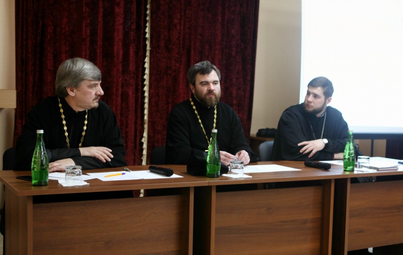 Руководитель отдела религиозного образования и катехизации Ростовской-на-Дону епархии священник Александр Верченко, благочинный Таганрогского округа протоиерей Алексей Лысиков рассказали о задачах Ростовской-на-Дону епархии в области сотрудничества с муниципальными общеобразовательными учреждениями в свете возможного расширения преподавания основ православной культуры на среднее звено школ. Таганрогское благочиния – одно из самых крупных в епархии и единственное, объединяющее городские и сельские приходы. Священники и помощники настоятелей по образовательной деятельности заинтересованно обсуждали проблемы преподавания основ православной культуры в современной школе. Главной из них остается качество подготовки учителей. Поэтому, кроме курсов повышения квалификации, в благочинии осуществляется система мероприятий ( образовательные чтения, совместные праздники), которые позволяют педагогам продолжать самообразование.