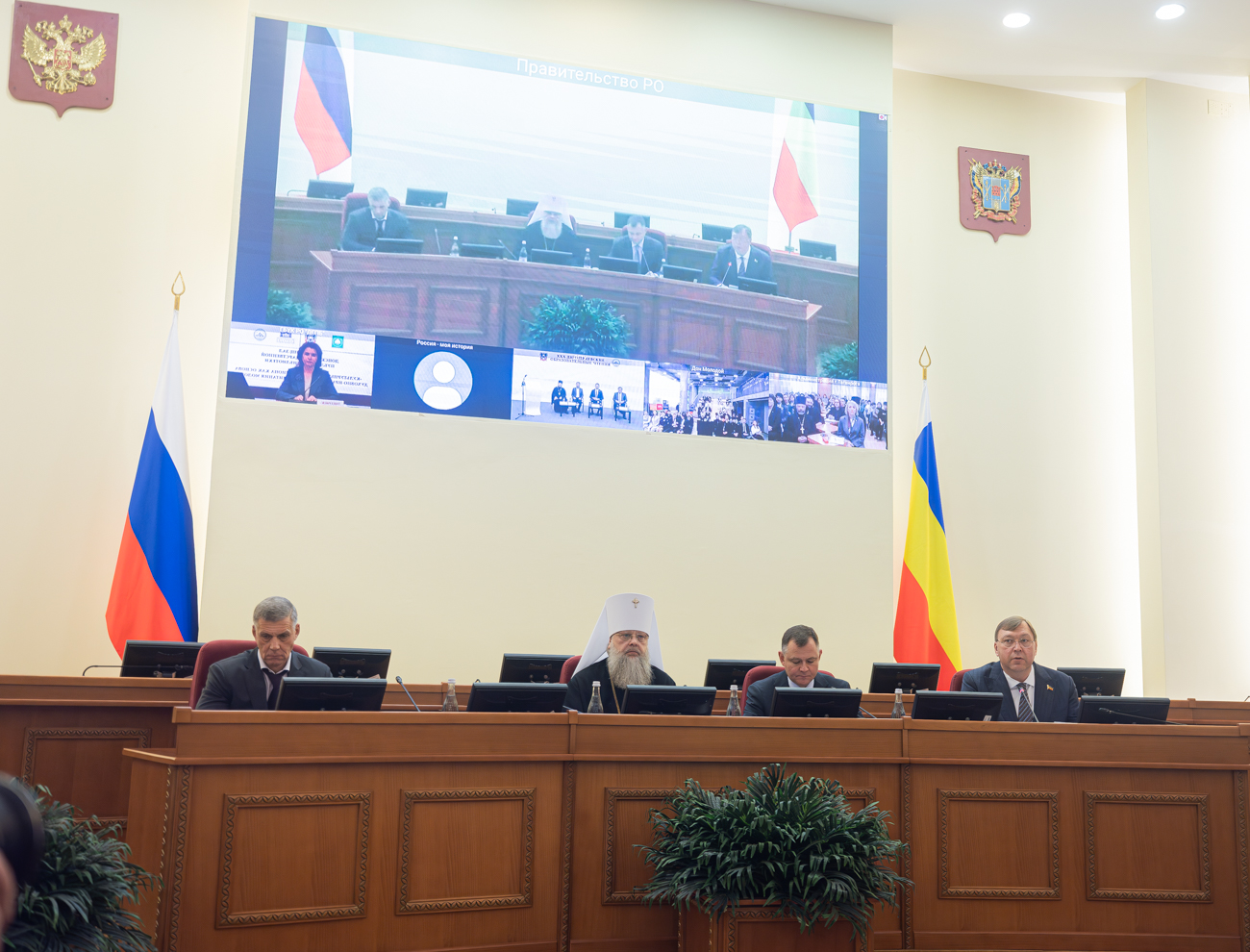 В президиум заседания вошли Губернатор Ростовской области Юрий Слюсарь, Глава Донской митрополии митрополит Ростовский и Новочеркасский Меркурий, заместитель полномочного представителя Президента Российской Федерации в Южном федеральном округе Антон Калинин, председатель Законодательного Собрания Ростовской области Александр Ищенко.